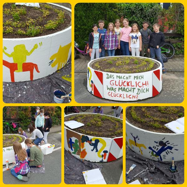 Voll bepackt mit Farben, Pinseln und vielen guten Ideen fuhr ein Teil der 4c am heutigen Dienstag, 8.6. 21 zu den Pflanzenkübeln in der Waldkolonie. Den noch weißen Kübel galt es mit fröhlichen Figuren im Keith Haring Stil zu bemalen.