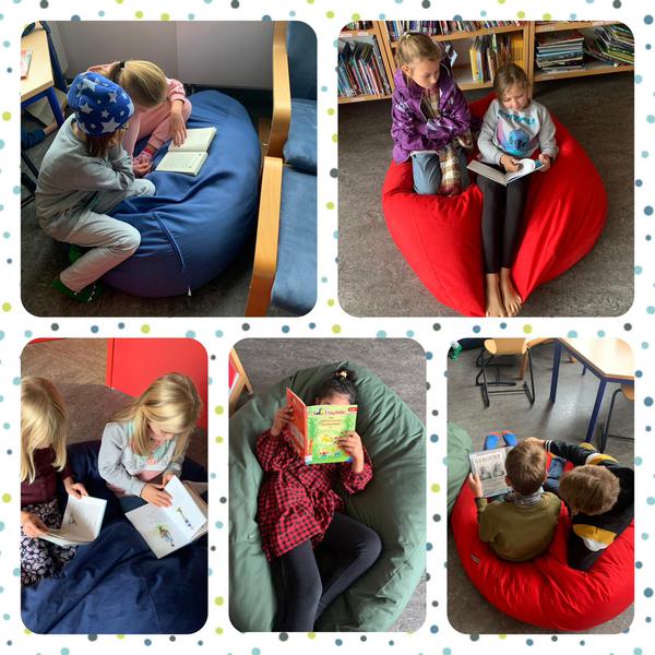 Ein sehr beliebter Ort bei uns ist unser Lesenest. Dort gibt es viele interessante Bücher und wir freuen uns immer, wenn wir die Gelegenheit haben, allein oder mit Freunden in diesen Büchern zu stöbern.