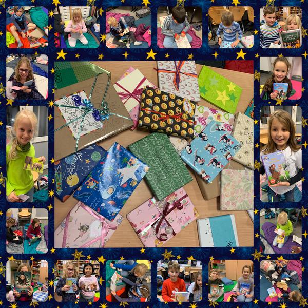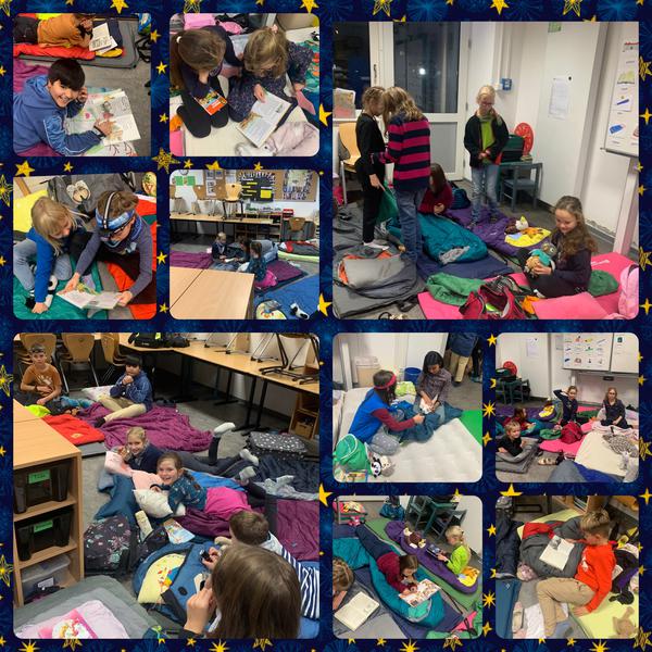 Die Eltern hatten vorab Buchgeschenke für Ihre Kinder besorgt und liebevoll in Geschenkpapier eingepackt. Mit strahlenden Augen packten die Kinder Ihre Pakete aus und freuten sich über die persönlichen Nachrichten, Briefe und Widmungen. Nachdem sich alle Kinder bettfertig machten, gab es noch eine freie Lesezeit, bevor Frau Hertel die Lichter ausmachte und allen eine Gute-Nacht-Geschichte vorlas. Nach und nach hörte man leise Atem- und Schnarchgeräusche aus den verschiedenen Teilen des Raumes.