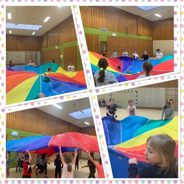 Nicht nur beim Faschingsumzug ist alles kunterbunt. Passend zu dieser Zeit haben wir im Sportunterricht kooperative Spiele mit dem Schwungtuch gemacht. Gemeinsam ließen wir die Bälle tanzen und Raketen starten. Das hat allen ganz viel Spaß gemacht. Sogar Smilla durfte mitmachen und wurde dabei ganz schön durchgeschüttelt.