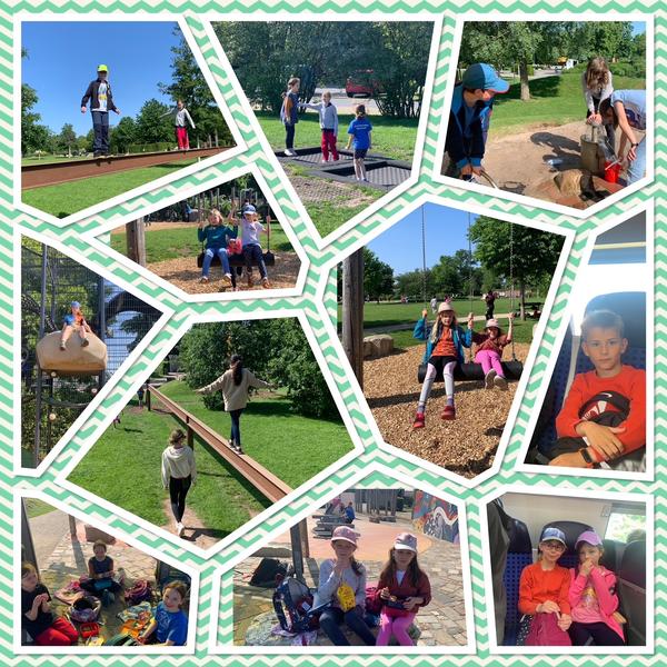 Nach dem Tanz liefen wir dann zum Bahnhof und fuhren mit dem Zug nach Hemsbach. Dort hatten wir noch einen kurzen Fußweg zurückzulegen, bevor wir die Anlage erreichten. Kaum hatten wir die Taschen und Rucksäcke abgestellt, verteilten wir uns auf dem tollen Gelände. Wir konnten klettern, balancieren, Räder schlagen, Fuß-Volleyball spielen, toben, im Sand bauen und noch so viele Dinge mehr erleben. Zwischendurch stärkten wir uns mit unserem Picknick.
