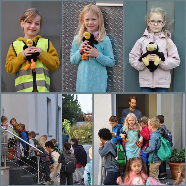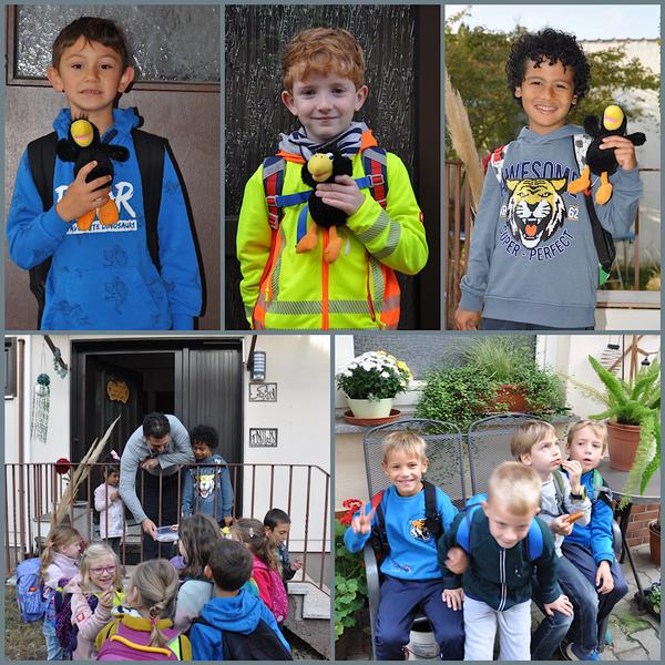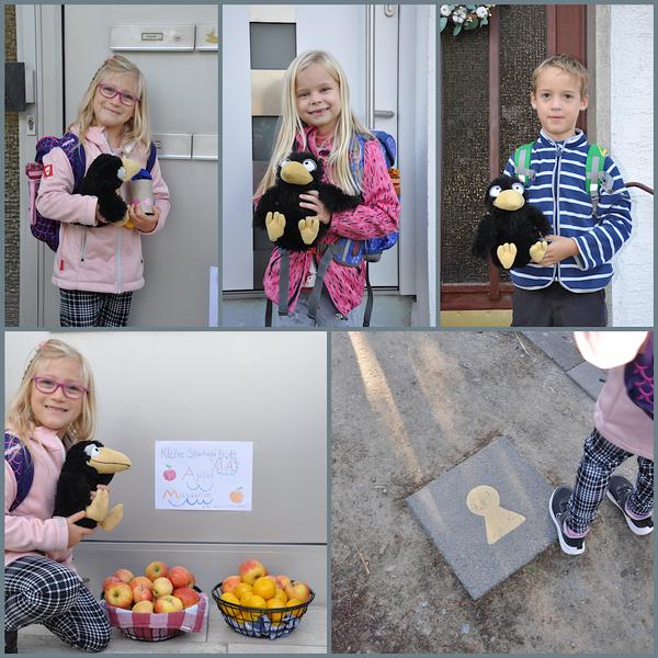 Dazu sind wir die Schulwege von 11 Kindern gemeinsam gelaufen und haben immer vor der Haustür Halt gemacht, um ein Foto von dem Kind mit einem der Raben zu machen. Manchmal wurden wir von Eltern und kleinen Geschwistern begrüßt, die zu Hause waren und es gab Waffeln und Süßigkeiten. Einmal gab es sogar eine gesunde Überraschung vor der Haustür.