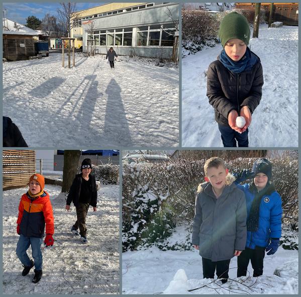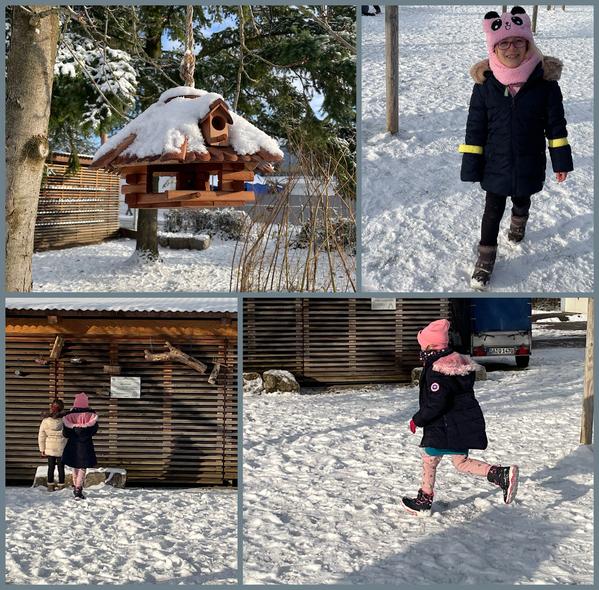 Heute haben wir unsere Bewegungsstunde auf der verschneiten Wiese vor dem Verwaltungsgebäude gemacht. Manche Kinder sind lachend durch den Schnee gerannt, andere haben Figuren geformt oder zusammen ein Iglu gebaut.